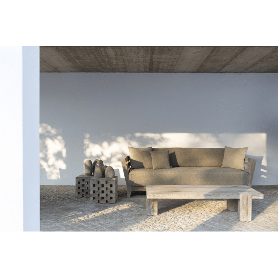 Gemaakt van teruggewonnen teak in een natuurlijke grijze afwerking, weerspiegelt de Dovetail tafel de duurzame en organische filosofie van Gommaire. De karakteristieke dovetailverbindingen benadrukken het vakmanschap en geven de tafel een unieke uitstraling. Of u nu kiest voor binnen- of buitengebruik, de Dovetail salontafel voegt een tijdloze charme toe aan elke ruimte.