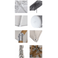 Openduwmodel en dicht trek model op gemakkelijke en snelle manier. Kantelbaar, tot 5 beaufort winden max 30 km/uur, afhankelijk van de juiste voet minimaal 35kg. Optie : hoes + voet al dan niet verrijdbaar.